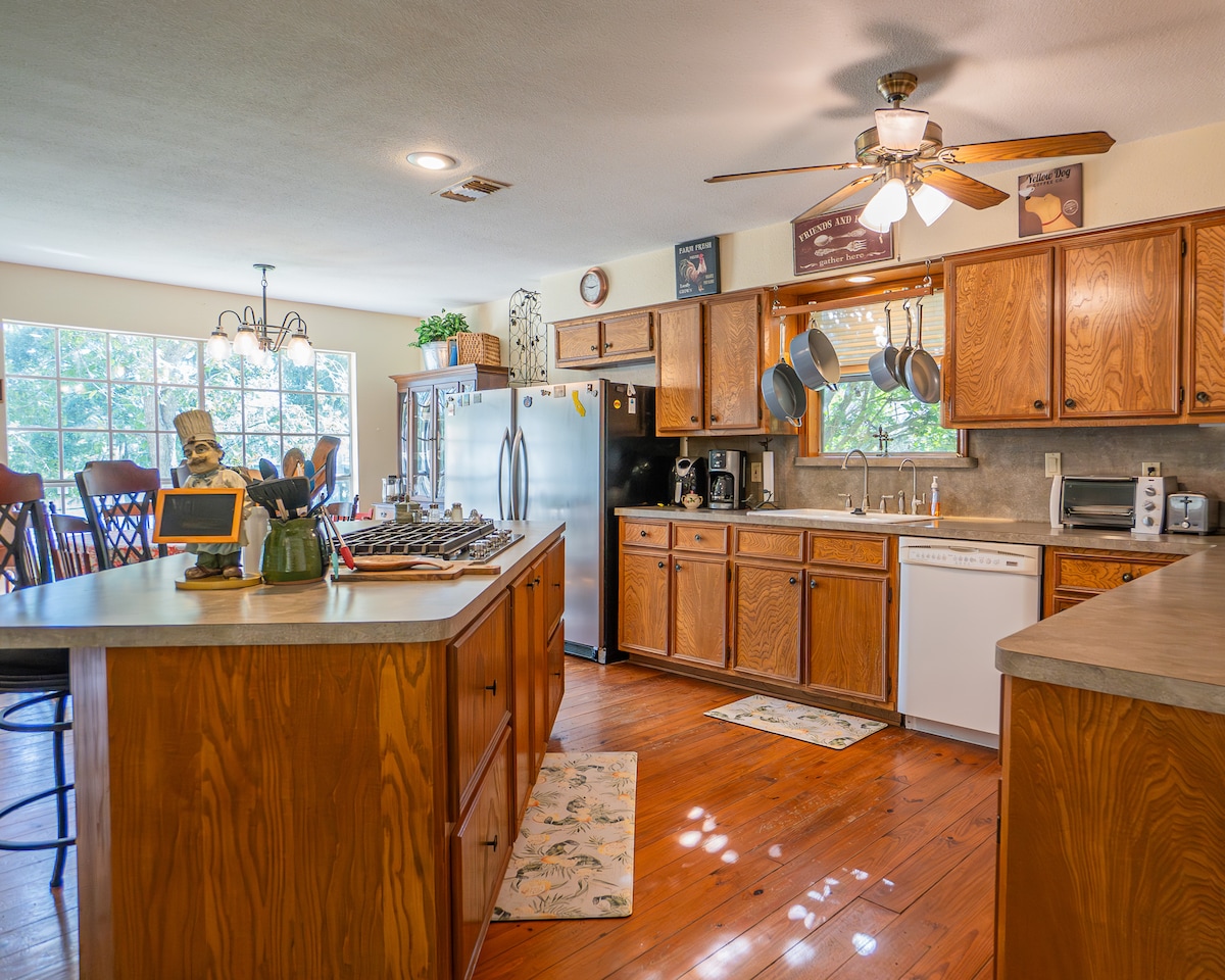 Step out back and fish from the all-weather Honey Hole. Enjoy our private yard with 200+ ft of creek frontage and access. Relax in our 2,400 sqft, 5-bed, 2-bath home 7 miles from Sargent Beach and the Intracoastal Waterway. Cook in the updated kitchen with creek and pasture views. Grill on the deck or unwind in the tented steel gazebo. Near San Bernard and Brazoria wildlife refuges, it’s perfect for bird watching and nearby kayak trips. Stream on smart TVs with high-speed internet!