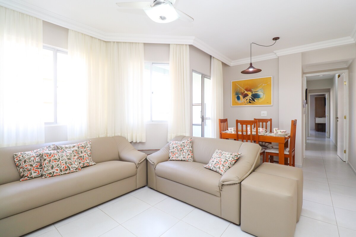 Departamento grande, espacioso y ventilado, balcón con barbacoa, redes de seguridad en todas las ventanas y balcones, aire acondicionado en todas las habitaciones (súper tranquilo), Wi-Fi, vista parcial al mar, garaje para 1 auto cerrado. Situado a pocos metros de Praia Brava y cerca de la playa suave. ¡Camas nuevas, suaves y cómodas!!