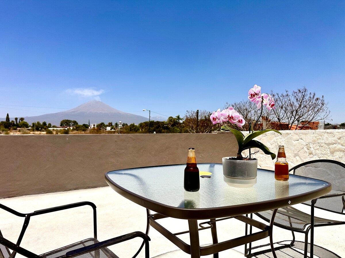 Relájate y descansa en nuestro cómodo y acogedor loft. Disfruta de la inigualable vista del volcán Popocatépetl desde la terraza. Se encuentra en el segundo nivel, entrada independiente por escalera exterior. Llegada autónoma. Estacionamiento en las instalaciones. A 6 minutos de Xtremo Parque o aeródromo. IMPORTANTE: No hay transporte público en la zona, no recomendamos este alojamiento sin automóvil, es muy complicada la movilidad sin auto 🚘.