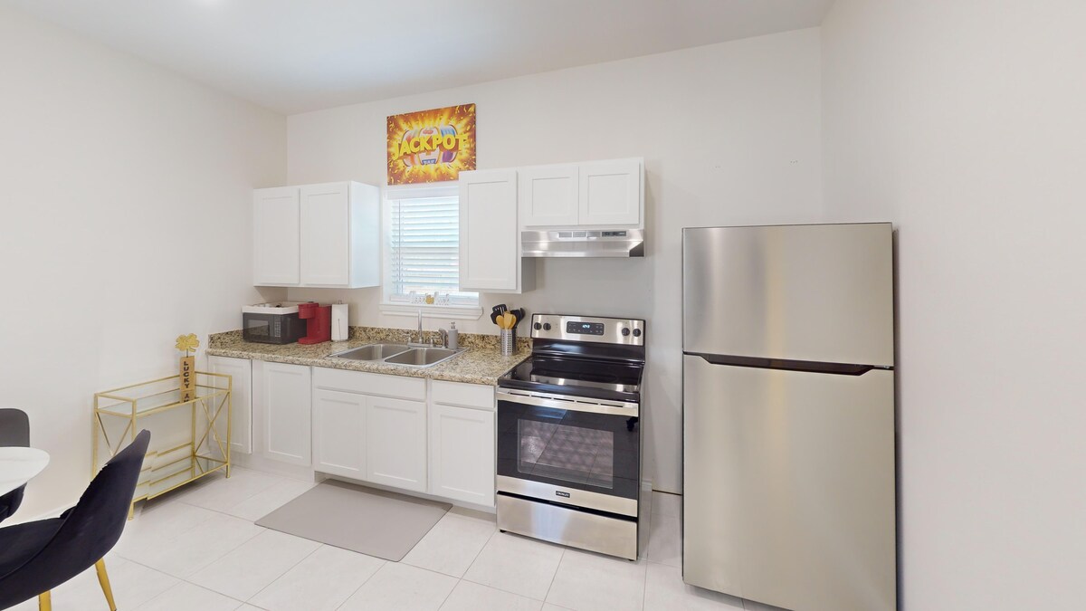 Ven a alojarte en este elegante y acogedor apartamento para tu escapada de suerte. Este apartamento de 2 dormitorios y 2 baños aloja cómodamente a 4 personas. Se encuentra a poca distancia a pie de restaurantes, bares y del famoso casino Texas Lucky Eagle Kickapoo. Este apartamento cuenta con todos los muebles y accesorios nuevos. Cuenta con una sala de estar con cocina totalmente amueblada. Nevera, estufa, microondas y wifi gratuito son algunas de nuestras excelentes comodidades. Contiene una lavadora y secadora con 3 televisores, 1 en cada dormitorio y 1 en el salón. ¡Haz de nuestro hogar el tuyo!