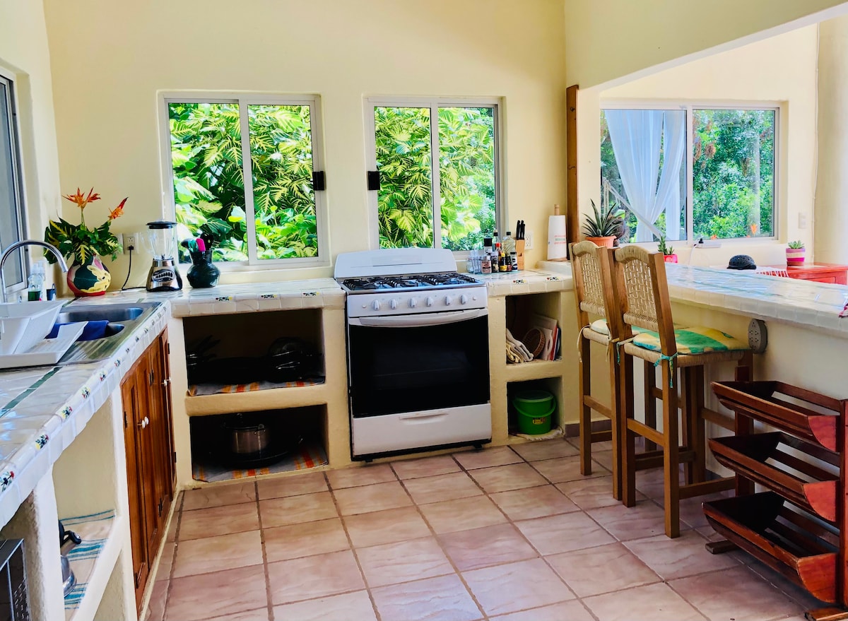 Casa Coco, está localizada en una zona muy tranquila, ideal para contemplar el amanecer y ver el sol salir por la montaña. De la calle principal a casa coco deberas de subir 61 escalones si vienes caminando, tambien contamos con acceso vehicular y estacionamiento sobre la calle. La casa esta equipada con una recamara con cama king y AC, baño privado con agua caliente, cocina, comedor, una fresca sala con vista a la copa de los árboles, y terraza con hamaca. Internet Starlink de alta velocidad
