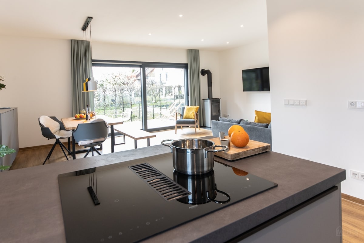 Nuestro luminoso apartamento de nueva construcción, con entrada independiente y unos 70 m², ofrece un amplio espacio para dos adultos. Nuestra sala de estar/comedor abierta con cocina equipada, estufa de leña, Smart TV en la sala de estar y el dormitorio, equipo de música, wifi y calefacción por suelo radiante hacen que la estancia sea acogedora y confortable. Amplio baño con ducha a ras de suelo y ventana. Desde la sala de estar se accede a la terraza de madera de unos 20 metros cuadrados. El apartamento de vacaciones está a unos 300 metros de la playa y de la península.