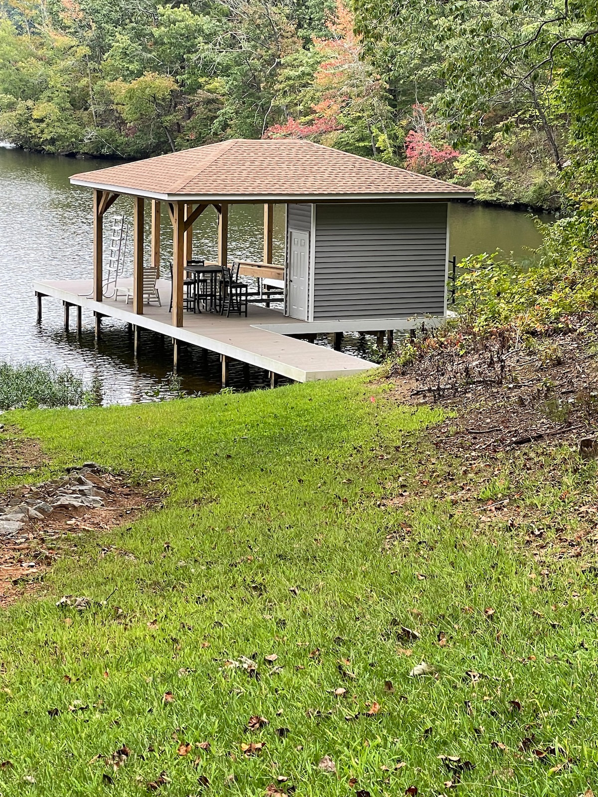 Piscina privada en el lago con cobertizo para botes de 2 niveles