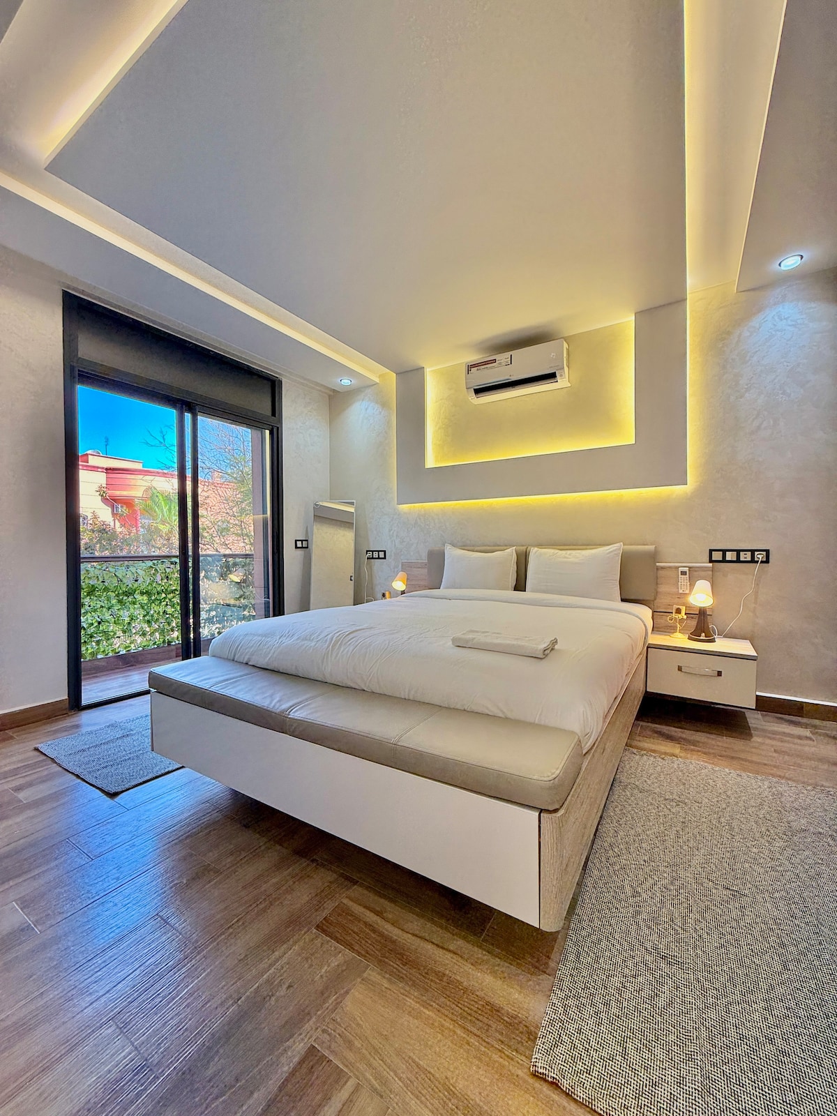 Bel Appt dans une résidence luxueuse fermée et sécurisée avec piscine et jardin privatif, situé à 5 mn en voiture et à 20 mn à pied de la Koutoubia et de la Médina. Centre commercial Al Mazar et Carrefour à 7 mn à pied. Abonnement gratuit NETFLIX et toutes les chaînes TV disponibles sur IPTV. Possibilité de disposer d’une femme de ménage/cuisinière à la demande à petit prix.
