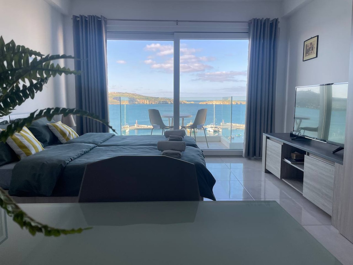 Wake up to stunning 180° sea views from this modern 3rd-floor studio with a private balcony overlooking the bay. Bright, stylish, and fully equipped, the studio is ideal for couples or solo travelers seeking a relaxing coastal stay. Steps from the promenade, cafés, swimming spots, and restaurants. This apartment is air-conditioned, includes a fully equipped kitchen, dining area, 2 single bed's, bathroom with shower. Washing machine, tv and high speed WiFi also included.