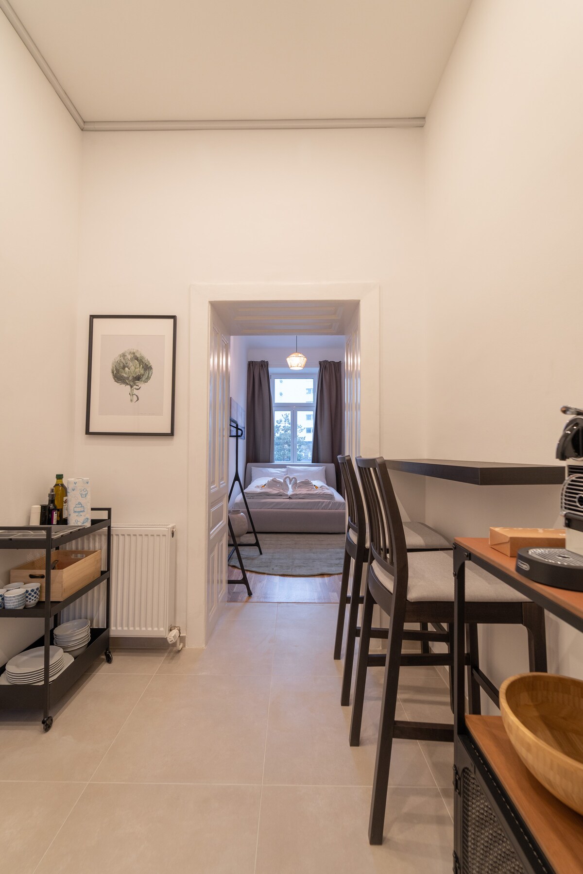 Nuestro estudio Gustav Klimt es un apartamento compacto con una ubicación excepcional. El Belvedere Palace está a la vuelta de la esquina y se puede llegar al centro de la ciudad en cuestión de minutos. Datos y características: • experiencia similar a la de un hotel • fácil acceso al transporte público • apartamento de 41 m² con techos altos • impresora multifunción disponible • administrado profesionalmente