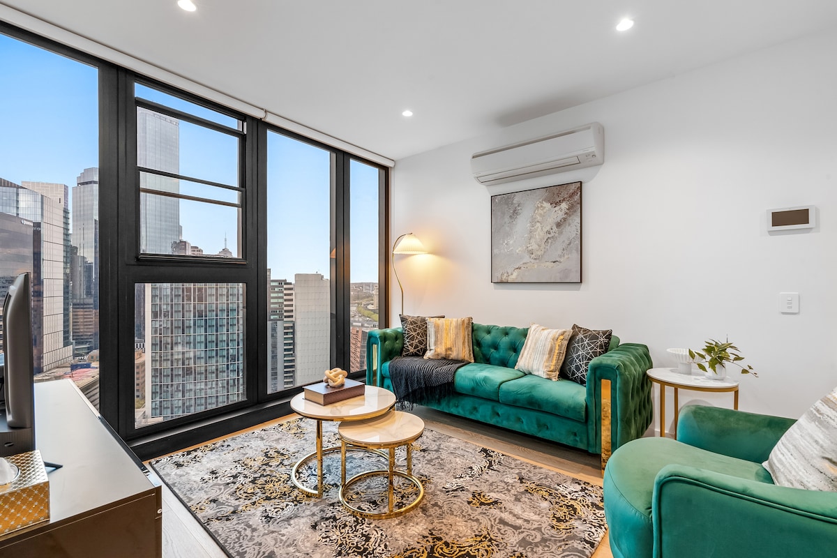 Step into your warm and stylish city pad, positioned on the corner of Melbourne’s buzzing CBD. From Marvel Stadium over Southern Cross Station to the lights of Lonsdale Street, the sweeping views create a true city backdrop. Inside, colourful art, cosy furnishings, and thoughtful details make it feel like home, not a hotel. Sip wine on the balcony, cook family meals in the fully equipped kitchen, or relax on the sofa with streaming after a day exploring nearby shopping, dining and events.