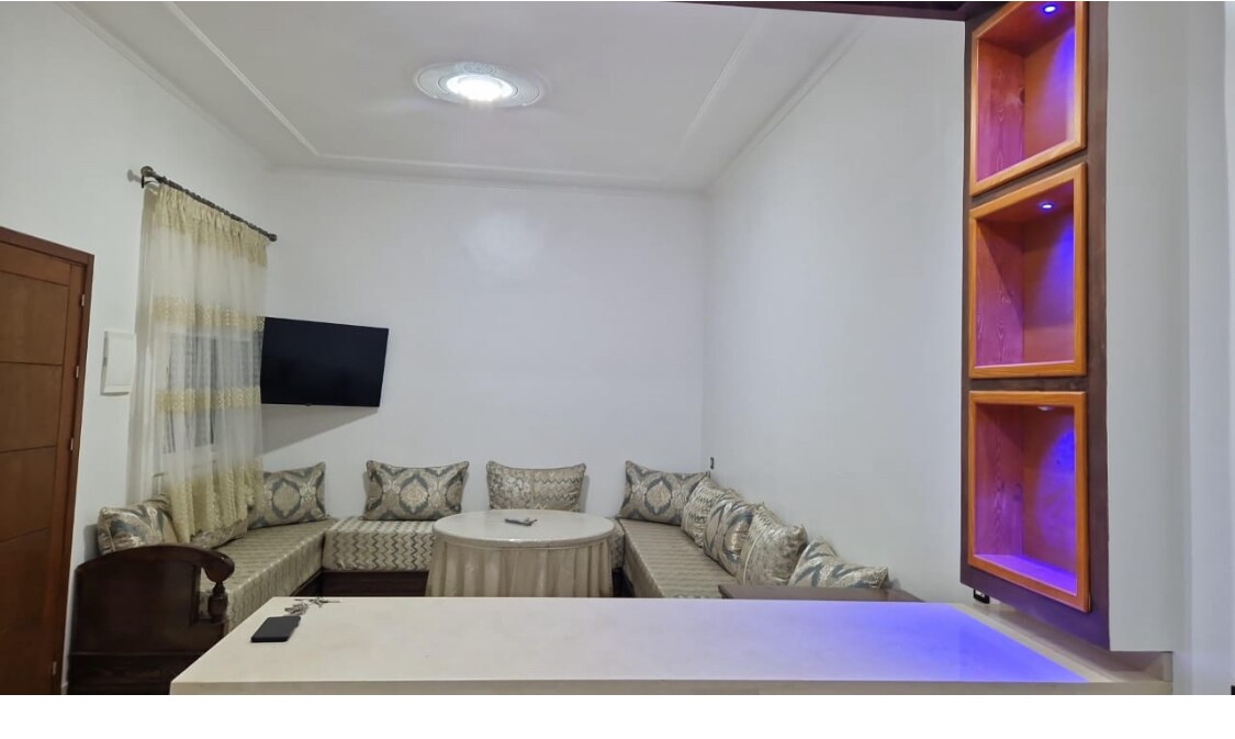 ¡Bienvenidos a su hogar familiar en Nador! Este espacioso apartamento ha sido diseñado pensando en la comodidad, espacio y privacidad. Ideal para familias o grupos de hasta 5 personas, ofrece un ambiente cálido, moderno y totalmente equipado para que disfrutes de tu estancia al máximo. Ubicación privilegiada: • A solo 7 minutos en coche de la hermosa laguna de Marchica (acceso fácil en taxi) • A 10 minutos caminando del tradicional zoco Oulad Mimoun. • A 5 minutos a pie de la Clinique Al Wahda.
