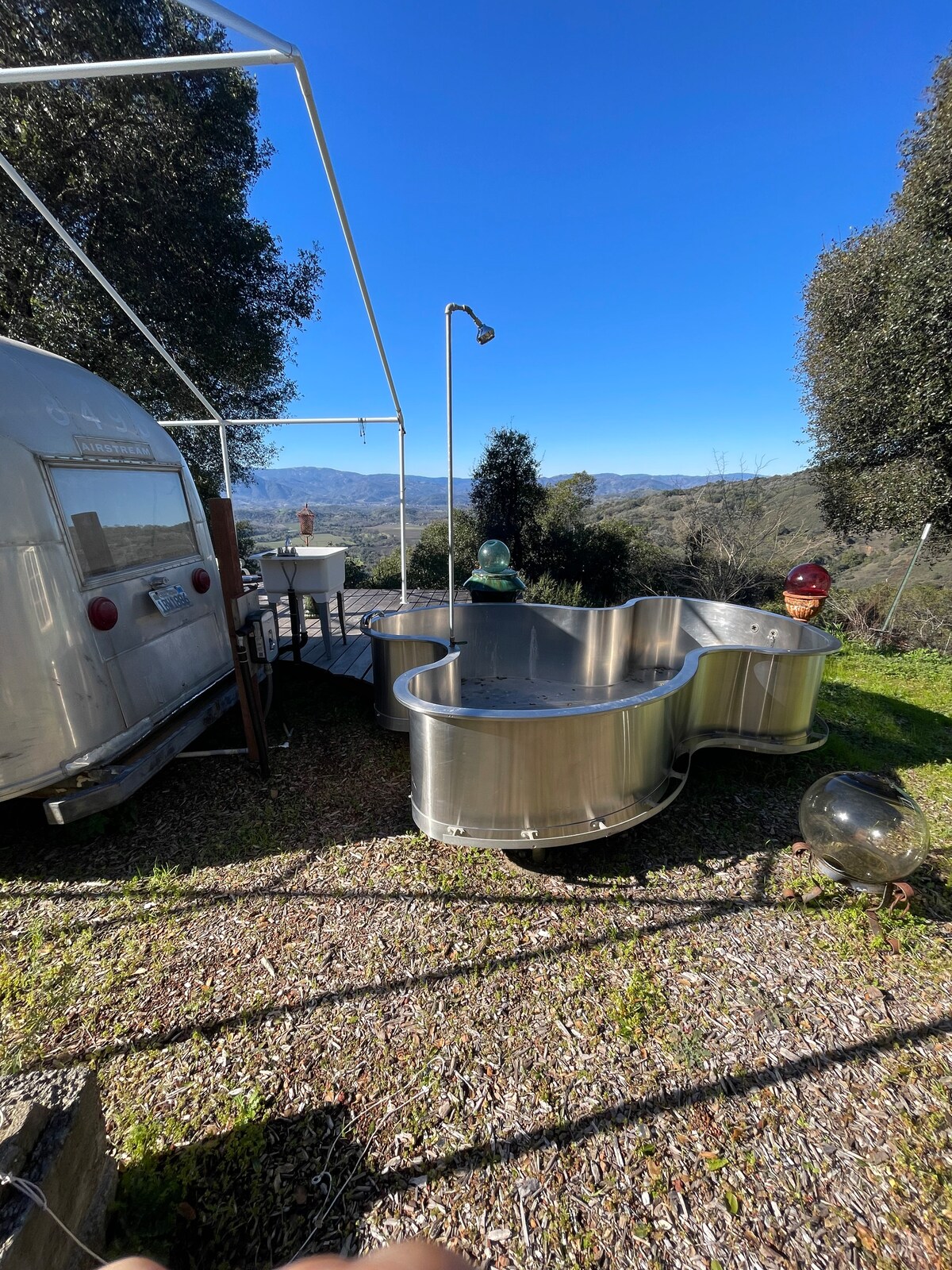 Go glamping in deluxe like-new fully air conditioned 25’ Airstream Flying Cloud with shore power, high speed Starlink internet, double your living space with large 8' x 20' private patio deck with Adirondack chairs, shade umbrella and spectacular view of Mt. Konocti. Owner’s large private in-ground salt water pool & swim up hot tub available for separate $25 daily rate. Book pool use directly with owner. Farm tour included in stay. Consider renting with Ozland Airstream One for larger groups.