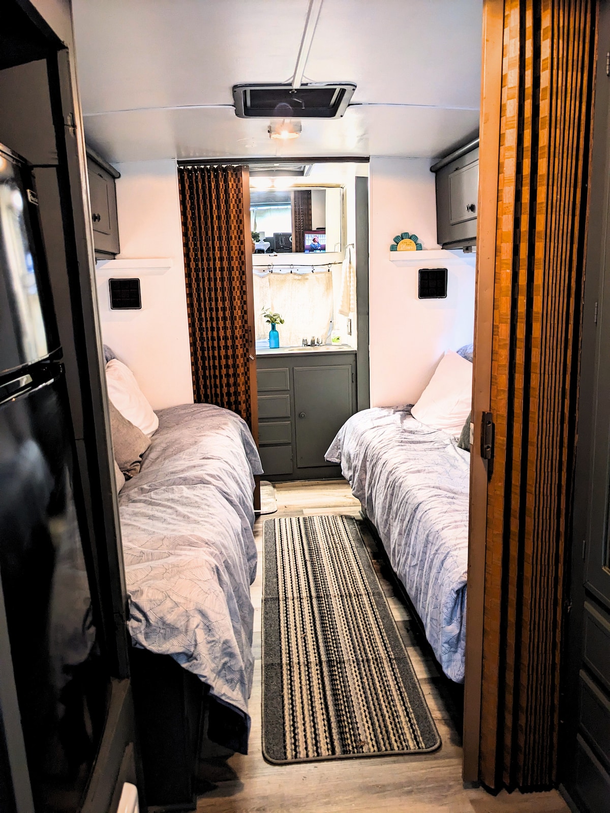 Welcome to our charming Retro RV nestled in the serene surroundings of Blue Lakes Village RV Park, just across the highway from the pristine waters of Upper Blue Lake. Nostalgia will take over as you step into this restored vintage camper equipped with modern amenities. Fall asleep to musical crickets, awaken to birds chirping. Take advantage of the amenities offered by the RV park, including access to the lake and a variety of lawn games. Kick back at our "no frills" RV & Tiny Home Park.