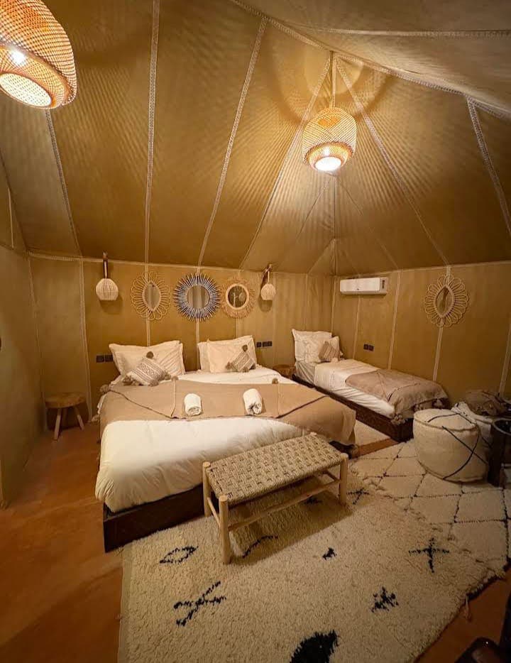 Nuestro campamento, enclavado en medio de las dunas, alberga 10 amplias tiendas de campaña, cada una equipada con inodoros y una ducha privada. Cada tienda tiene una puerta con cerradura individual por dentro y por fuera, con un candado proporcionado de forma gratuita por nuestro servicio. Dentro de estas tiendas de campaña de 26 metros cuadrados, encontrarás una cama tamaño king y una cama individual, todas equipadas con ropa de cama de alta calidad, incluidas almohadas, sábanas y toallas.