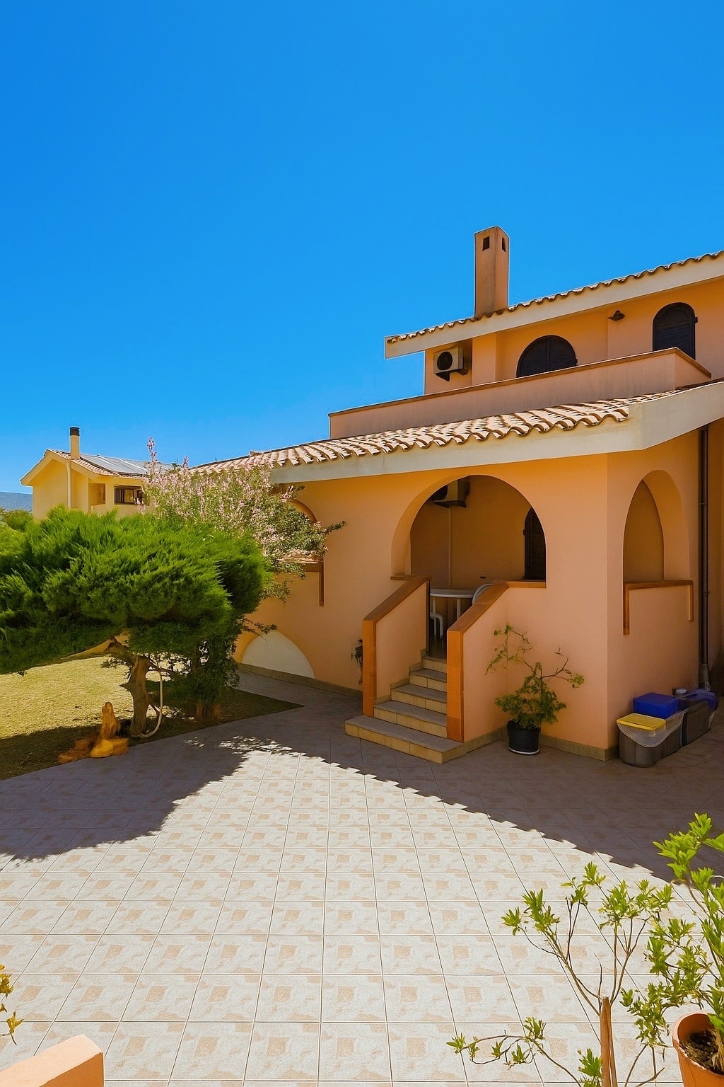 Unidad independiente de una gran villa adosada rodeada de un jardín privado y reservado. Sala de estar con sofá doble, comedor, cocina moderna y equipada independiente, tres dormitorios dobles (dos con entrada externa desde el patio privado), dos baños con duchas grandes, ducha exterior, patios con áreas de conversación, galería con comedor. Aire acondicionado. La Villa se encuentra en la prestigiosa zona residencial “Collinetta di Capo Boi” custodiada por un cuidador. La playa está muy cerca, a 150 m.