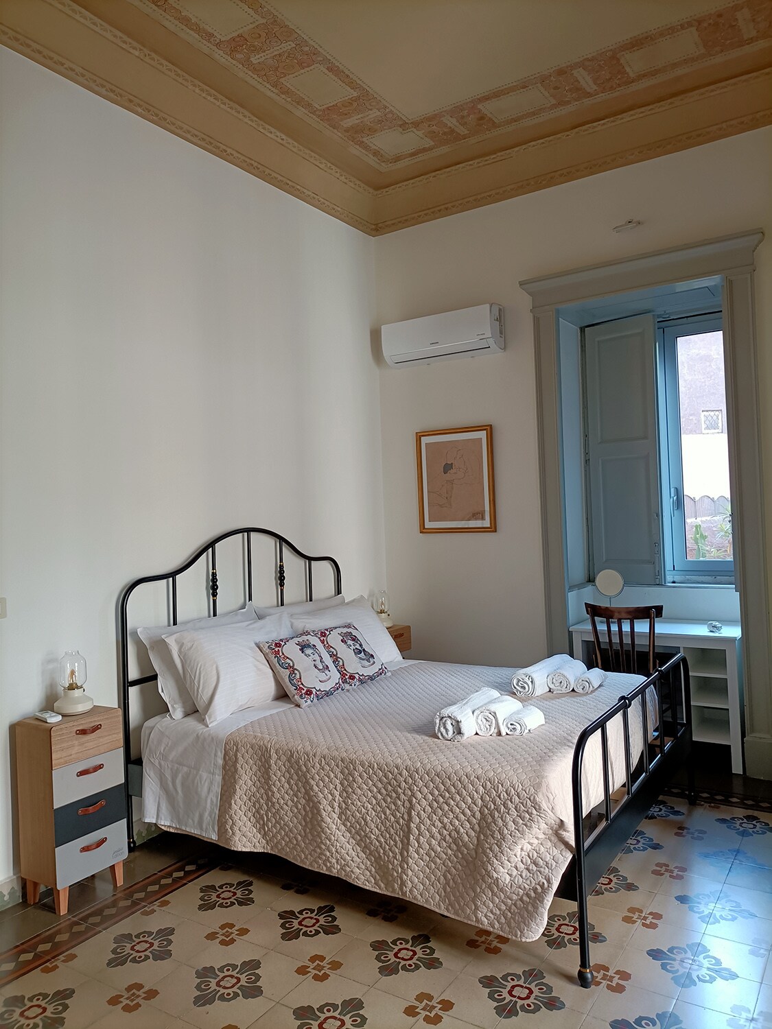 Disfruta de unas vacaciones con estilo en este exclusivo apartamento en el centro histórico, en la planta principal del Palazzo Mannino: los antiguos techos con frescos de 5 m de altura y la vista a Via Etnea lo hacen único. Activo desde mayo de 2022 y ahora gestionado directamente por el propietario, se encuentra en la tercera planta sin ascensor. Consta de 2 dormitorios dobles (uno con cama + sofá cama), 2 baños, cocina grande, pequeña terraza y lavandería. Desde el balcón se puede admirar la belleza del volcán Etna.