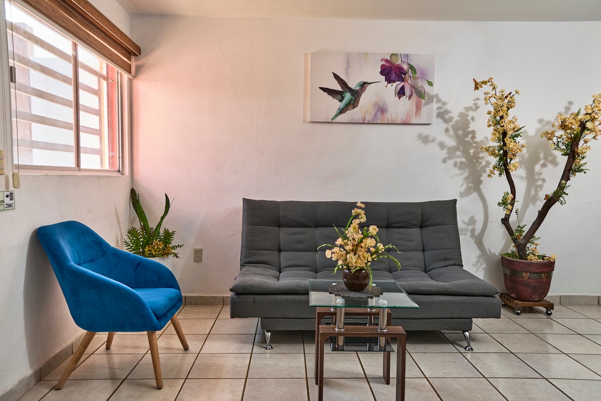 "¡Bienvenido a nuestro nuevo y encantador departamento, a tan solo 5 minutos del vibrante corazón de Sayula! Este espacio es ideal para alojar hasta 4 personas con comodidad y estilo. Tu hogar temporal ha sido meticulosamente preparado para ofrecerte todas las comodidades que necesitas, asegurando que tu estadía sea memorable. Experimenta la diferencia de hospedarte con Flats en Mi Lindo Pueblito, donde cada detalle se ha pensado para hacer de tu estancia una experiencia única e inolvidable."