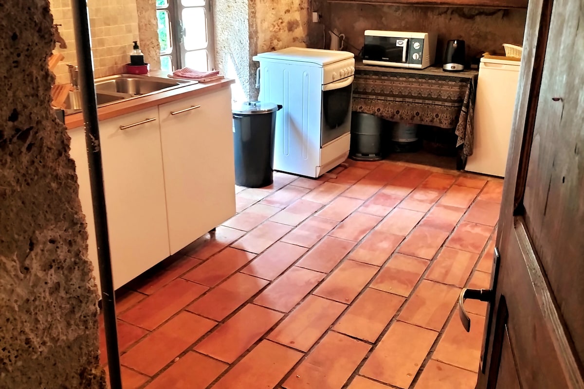 La propiedad incluye una casa residencial construida contra el acantilado y un molino sin restaurar construido sobre un resurgimiento, con un estanque de agua limpia y una hermosa cascada. Se alojará en la casa de huéspedes que puede alojar a 8 personas sin temor a molestar a los vecinos. Las camas se distribuyen en la planta superior entre un dormitorio con una cama grande y lavabo y un gran dormitorio equipado con 3 camas grandes + otra cama doble en el altillo, debajo del techo.