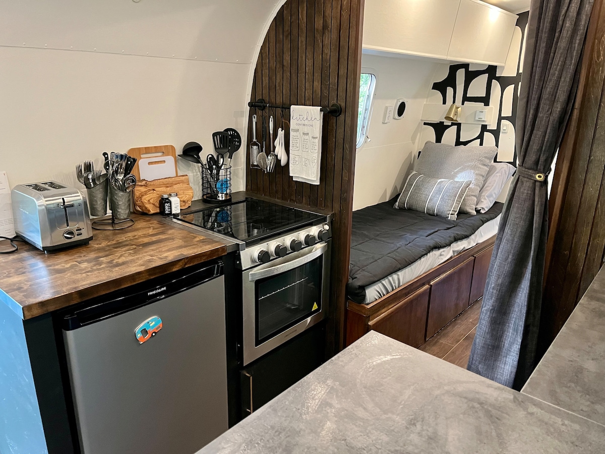 Airstream vintage junto al arroyo con servicios modernos y aire acondicionado