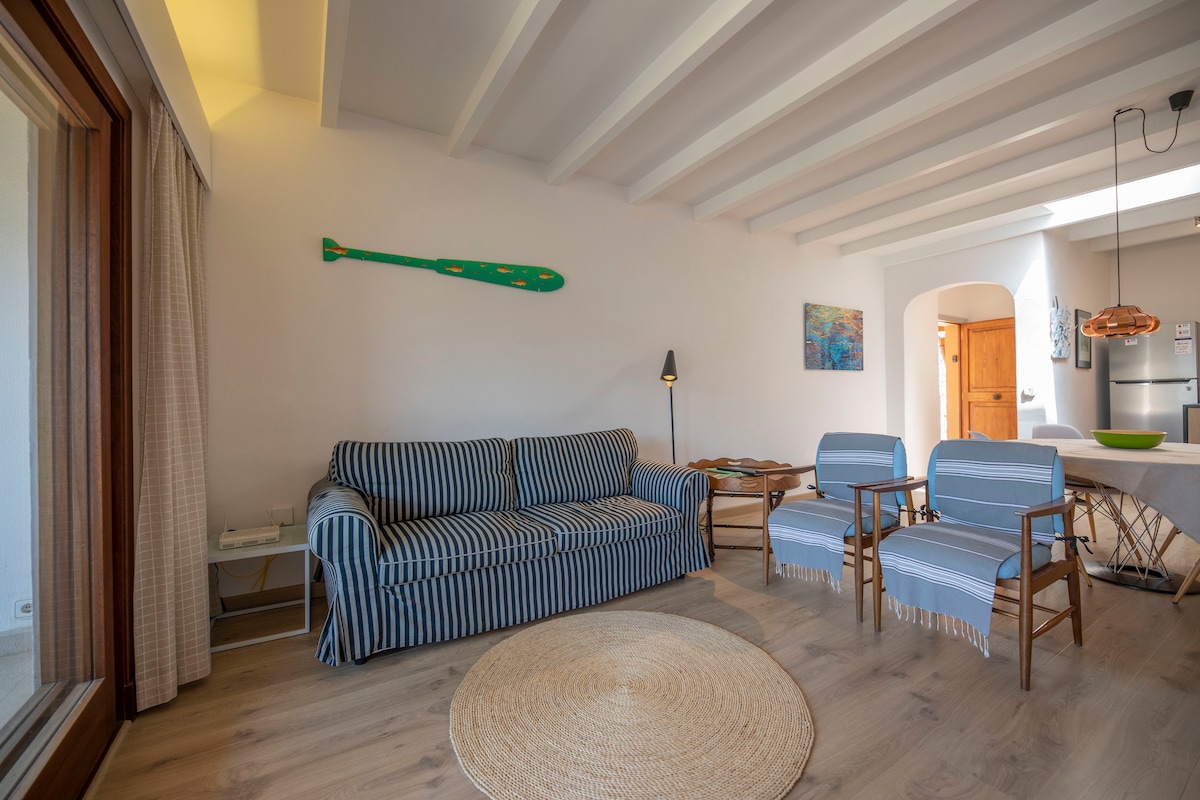Este encantador apartamento está en el centro, a solo 50 metros de la playa. Cuenta con un luminoso comedor con aire acondicionado, sofá cama y mesa de trabajo, que da acceso a una terraza amueblada. El dormitorio tiene cama doble, amplio armario y ventanal con salida a la terraza. El baño es completo, con ducha, y la cocina está totalmente equipada. SES TAPARERES A - ETVPL/15935