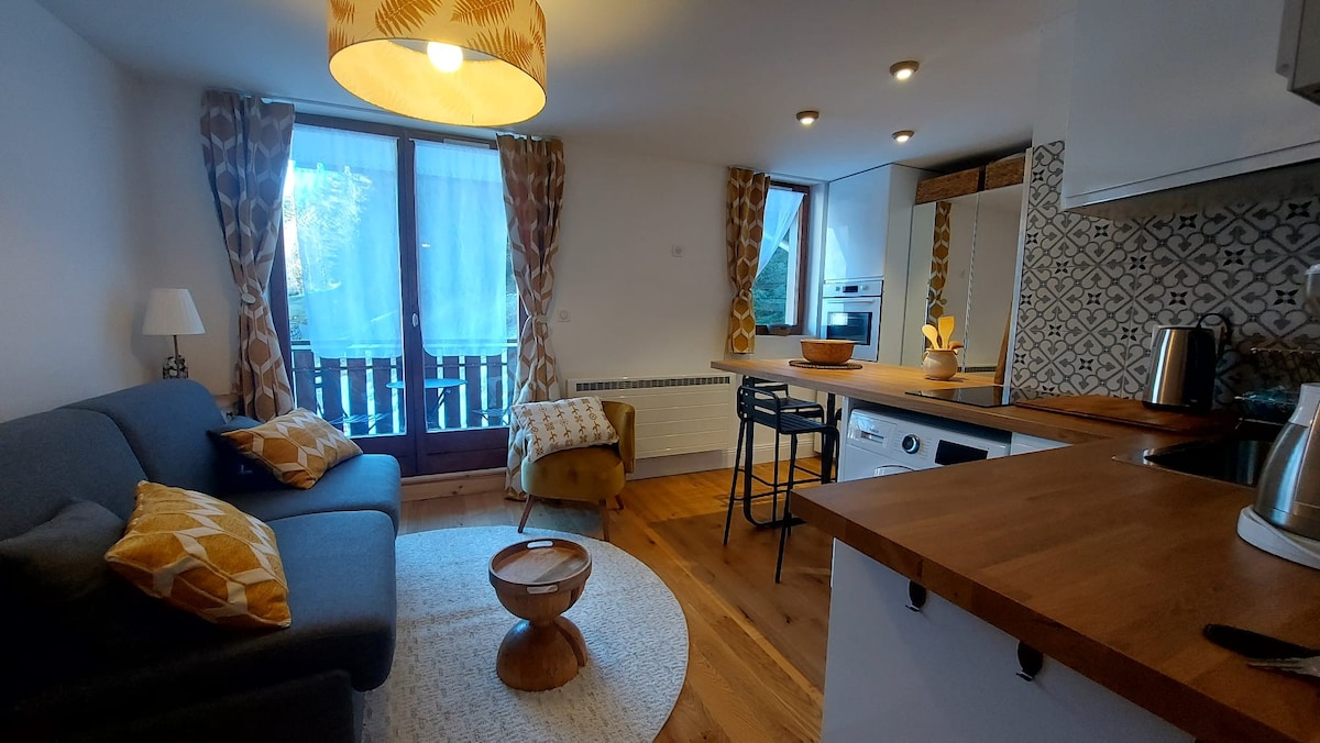 Apartamento situado en una casa de campo en la planta baja con acceso independiente y autónomo. Encontrará una habitación y estancias cocina abierta todo situado frente al Mont-Blanc. Se trata de un dormitorio con cama de matrimonio y cama individual altillo. Ropa de camajunio2022 También hay un baño privado con ducha de hidromasaje, radio,etc. Una cocina abierta a la sala de estar con sofá esquinero convertible de 2 camas de buena calidad. aparcamiento cubierto cerca del chalet Despeje asegurado