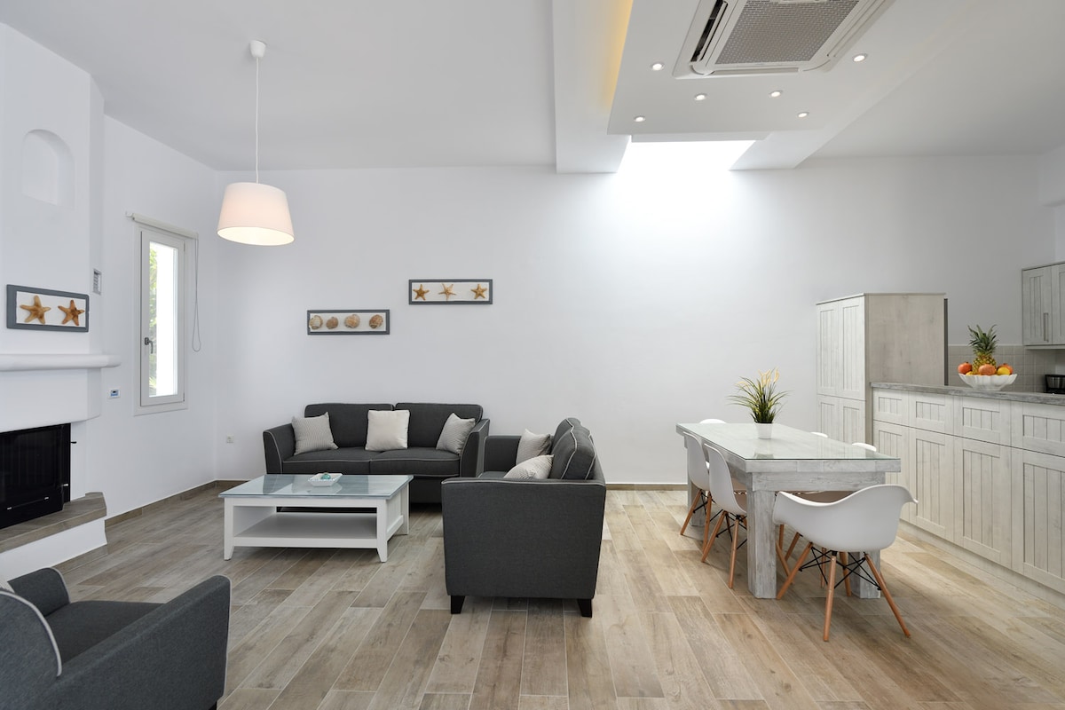 Una hermosa casa especial en el centro de la ciudad de Naxos. La arquitectura de las Cícladas se combina con la línea moderna en todas las dimensiones... La casa consta de 2 dormitorios dobles, 3 baños, cocina grande, sala de estar, televisores en todas las habitaciones, aire acondicionado, calefacción por suelo radiante, bomba de calor con agua caliente las 24 horas, ¡jacuzzi-Spa!