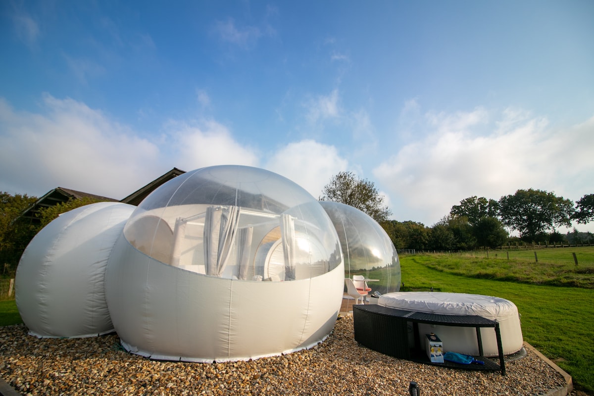 The Bubble, which works on a slightly over pressurised system where the air continuously refills the tent is set up on an old working farm. Its the ultimate experience of nature and total comfort. Guests can fully enjoy the peaceful surroundings and wonderful open farmland. Sit back in your very own private hot tub and enjoy the view of the rolling fields. This accommodation has air conditioning. Not suitable for children under 4 We have other bubbles see them by pressing on my profile