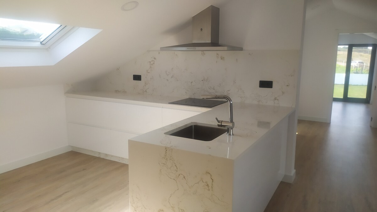 Cosy open studio (~30m2) for max. 4 persons overlooking the Doniños beach with a queen bed 1,60x 2,00 and a sofa convertible in a queen size bed 1,60x2,00. A fully equipped kitchen and a private bathroom with shower. Fireplace for heating .Fiber internet high speed Estudio abierto (~30m2) para max. 4 personas con vistas a la playa de Doniños que contiene una cama de 1;60x 2,00 y un sofá convertible en una cama 1,60x2,00. Cocina completa y baño privado con ducha. Chimenea ( cassette Wifi fiber