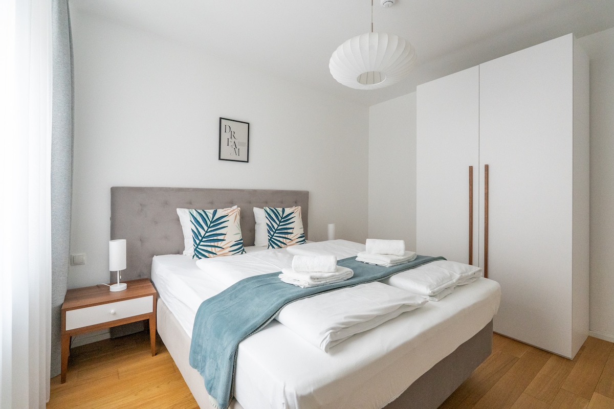 With comfort and quality time in mind, our modern, contemporary designed and brand new three bedroom 4beds&more apartments can comfortably accommodate up to 8 guests. Rooms are furnished with high end fittings, state of the art amenities and generous, bright living spaces, offering a top quality city living experience. These apartments consist of one bedroom with a super king size bed, another two bedrooms, with either a bunk or fold-out twin guest bed and a lounge area with a sofa bed for 2.