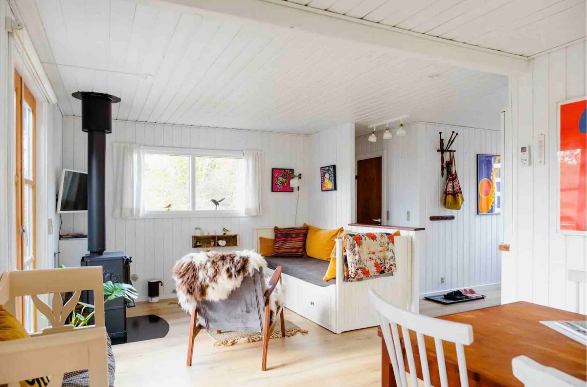 Acogedora casa de madera americana situada en un terreno natural protegido en Femmøller, Parque Nacional Mols Bjerge. La casa está amuejada de forma sencilla y con buen gusto, y es ideal para un fin de semana romántico, unas vacaciones con niños pequeños o mayores, como refugio de trabajo o simplemente como un lugar para sumergirse en un entorno tranquilo cerca de la naturaleza. La zona ofrece una gran cantidad de experiencias en la naturaleza con buenas rutas de senderismo y ciclismo, paseos a caballo, kitesurf, pesca y buenas playas para niños.