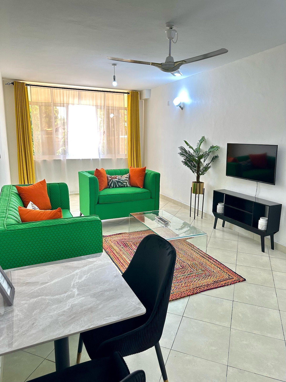 Un apartamento moderno y espacioso de 2 dormitorios en Nyali, Mombasa, junto a la playa. El apartamento está totalmente amueblado de dos dormitorios, con dos piscinas y un gimnasio, una cocina totalmente equipada y una hermosa sala de estar que se abre a un balcón. Está ubicado en el cuarto piso y está a pocos minutos a pie de la playa. El centro de Nyali y el centro comercial City están a pocos clicks de distancia.