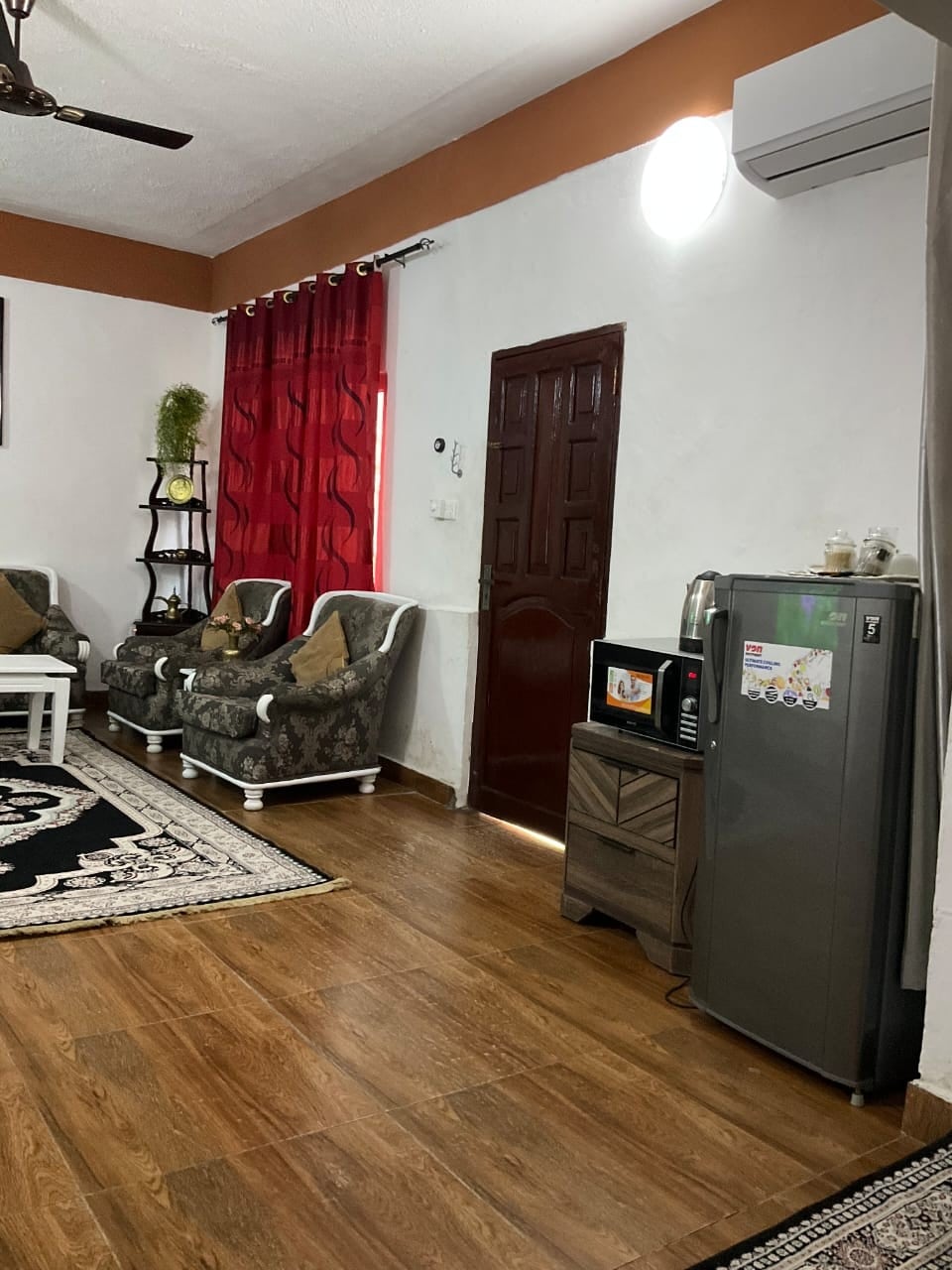 A solo 5 minutos a pie de la playa de Nyali, este acogedor apartamento estudio ofrece todo lo que necesitas para disfrutar de las vacaciones perfectas, una reunión o una estancia en la región costera de Mombasa/ Kenia. El espacio es el lugar perfecto para relajarse después de un día de exploración/trabajo, con una lujosa cama de teca africana (mvule), una encimera y una pantalla plana montada en la pared con acceso a cientos de canales. El apartamento tiene una nevera y un microondas que te harán sentir como en casa.