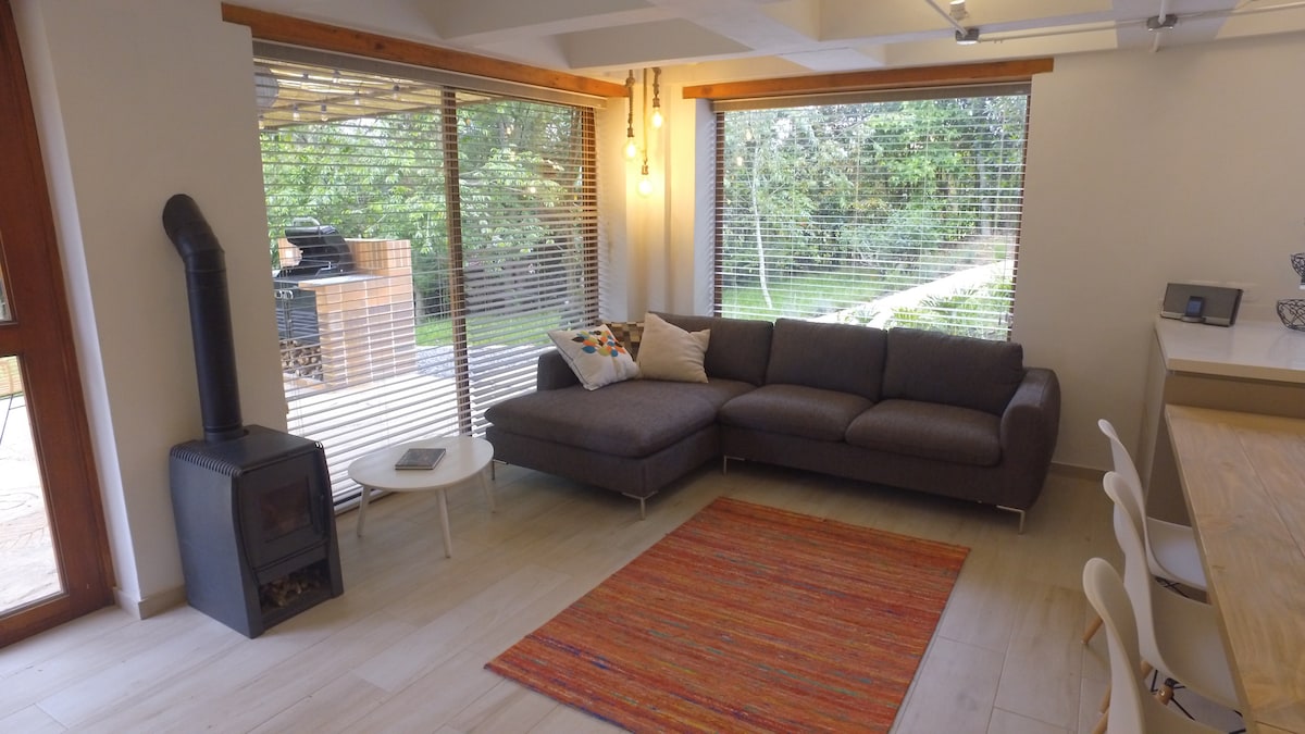 Moderno apartamento campestre a solo 10 minutos de Villa de Leyva, en zona tranquila y segura. Con 100m², el alojamiento cuenta con dos habitaciones, dos baños, sala principal con chimenea, sala de TV y con otros implementos necesarios para tu comodidad. La terraza de 35m² está equipada con un comedor auxiliar y BBQ a gas ideal para los amantes de los asados al aire libre. Todos los espacios están diseñados para descansar, conectarte con la naturaleza y disfrutar con tu familia y amigos.