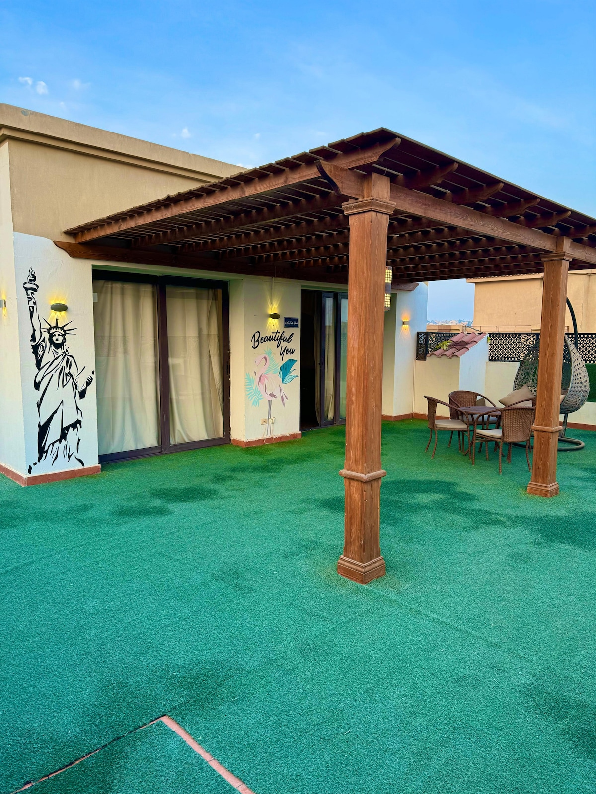 This unique place has a style all its own. Escape to a private rooftop retreat in the heart of Zayed, directly in front of Al Ahly Club . A unique studio designed for comfort, style, and tranquility. You’ll be perfectly located to explore the city while enjoying peace and privacy. Just 20 mins to the Grand Egyptian Museum of Civilization and 25 mins to the pyramids and Sphinx Airport. NB: No unmarried couples.