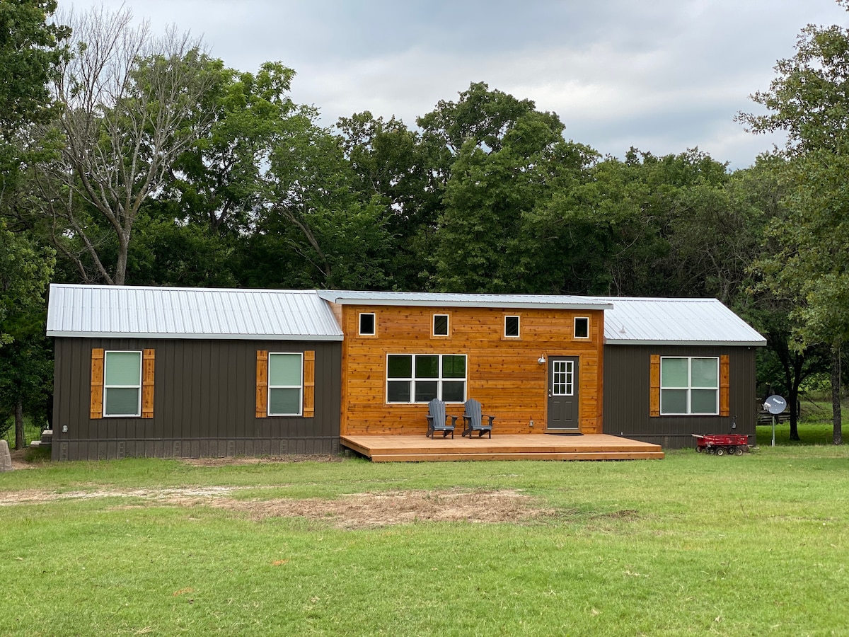 Si quieres escapar del bullicio de DFW pero no quieres conducir demasiado lejos, ¡este es tu lugar ideal! Acogedora cabaña moderna ubicada en 21 acres en la hermosa región de North Texas Hill Country. Detrás hay un arroyo privado perfecto para pescar. Haz senderismo, asa s'mores en nuestra zona de fogatas, descansa en hamacas o disfruta del amanecer y la puesta de sol en la terraza. Red de voleibol, cama elástica, columpios y otros servicios para que la familia disfrute del aire libre. Wifi disponible.