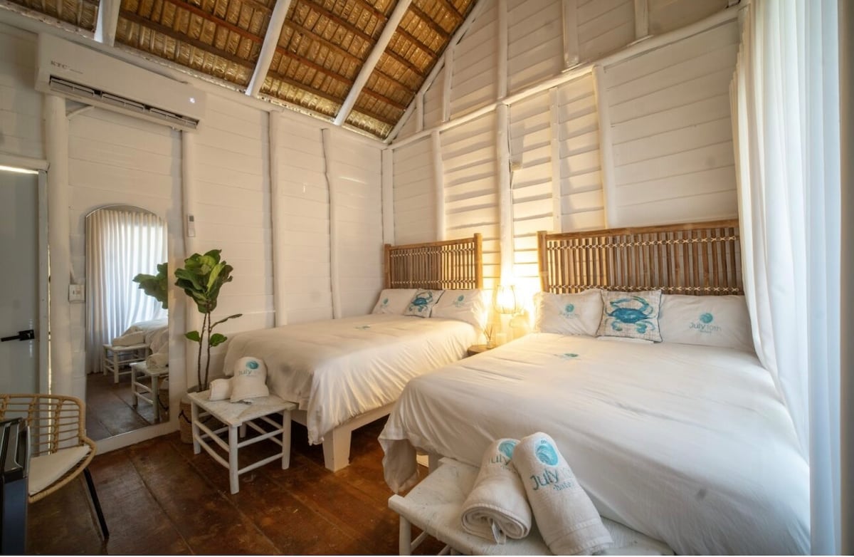 Perfectas para familias o grupos pequeños, nuestras suites de dos dormitorios frente a la playa ofrecen comodidad, privacidad y vistas impresionantes al mar. Cada unidad incluye dos dormitorios acogedores, un espacio compartido, baño privado y un balcón o terraza a pocos pasos de la playa. Despertate con el sonido de las olas, disfrutá de acceso directo a la playa y explorá los restaurantes cercanos y las excursiones a Cayo Arena. Con el encanto relajado del Caribe, tu estadía en Hacienda Del Mar se siente como estar en casa junto al mar.