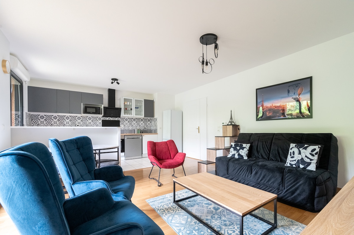 Apartamento de 2 habitaciones✦ reformado de 40 m2 + balcón ✦Autobús hacia Disneyland y el centro comercial Val d'Europe. ✦Ubicado en una residencia tranquila. ✦Encontrarás en el barrio: panadería, tienda de comestibles, farmacia, librería, peluquería, restaurantes. ✦También encontrarás un enorme parque arbolado con sendero de fitness y zona de juegos infantiles, así como un spa, una sala de actuaciones y, para los entusiastas del ciclismo, ¡el Pumptrack más grande de Francia!