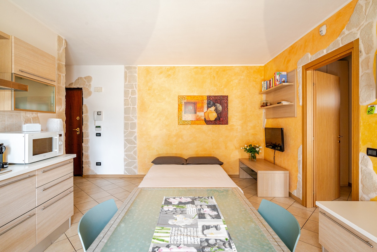 Amplio apartamento, a dos pasos del centro del pueblo, al que se puede llegar a pie, donde encontrarás las tiendas que necesitas. Estructura moderna y soleada que consta de: - Entrada - Amplio salón - Cocina moderna y equipada - 1 sofá cama - Habitación de matrimonio - Baño con ducha - 2 amplias terrazas - Cómodo aparcamiento Te alojarás en una tranquila zona residencial donde podrás relajarte y tener un espacio de trabajo dedicado, cómodo para la autopista A4 y la estación de tren