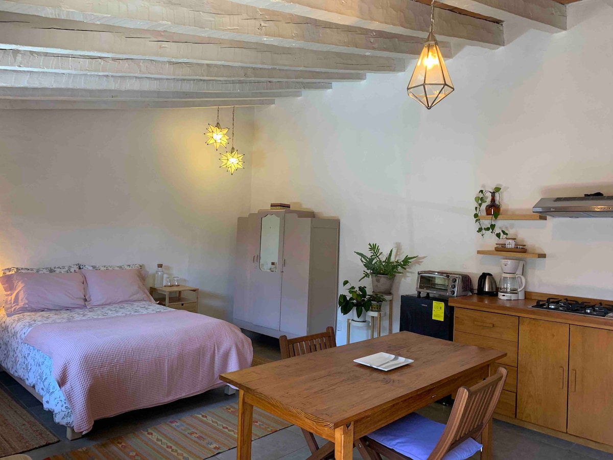 Loft de Origen hace honor a su nombre por estar construido con adobes fabricados en sitio con las técnicas ancestrales y con la misma tierra del lugar donde se encuentra. El espacio tiene doble altura y techos con vigas de madera. Vivir y dormir en un espacio hecho de tierra natural te acoge y armoniza con tu propio origen. Despierta con la caricia del sol de la mañana entrando por el jardín y disfruta el atardecer mirando al pueblo de noche por el gran ojo de la recamara en el mezzanine.