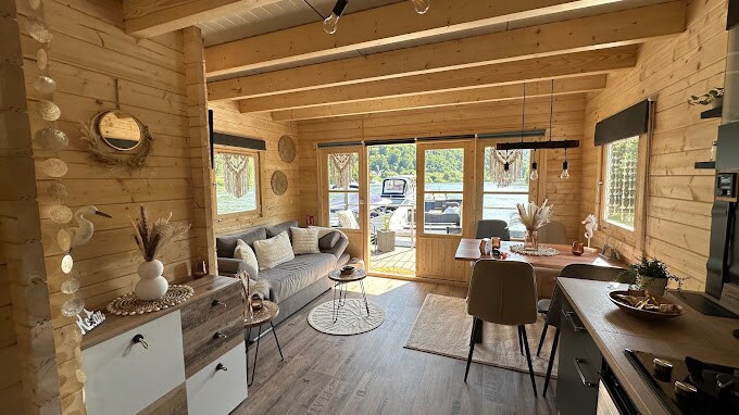 Vacaciones en una moderna casa flotante en el río Lahn. Disfruta de la naturaleza y la relajación en el agua. La casa flotante está equipada con materiales de alta calidad y cuenta con 2 habitaciones, un baño con ducha y WC y un trastero. Lo más destacado es la sala de estar/cocina abierta con terraza. Las puertas correderas se pueden abrir por todos los lados para estar aún más cerca de la naturaleza. La casa flotante se alquila en el amarre. Se pueden alquilar tablas de paddle surf y una pequeña lancha a motor sin licencia.