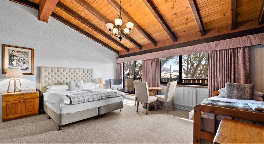 Chalet Quad rooms are larger style hotel rooms accommodating a maximum of 4 persons. The bunk is situated in a smaller ante room whilst the king bed or 2 single beds are in the main room. After a day on the slopes, retreat to your room, where rich timber accents, plush furnishings, and soft ambient lighting create a cosy, gemütlich atmosphere. BEDDING 1 x king bed and one bunk OR by request: 2 single beds and one bunk RATES Room rates include full buffet breakfast for each guest.