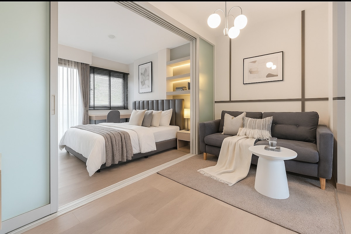 Enjoy a cozy, 24 sqm studio just 5 minutes from Bearing BTS. This modern apartment features natural light, blackout curtains, and a private kitchenette with essential amenities. Located in peaceful Bangna, it’s surrounded by local markets and food stalls. Shared building facilities include a gym, laundromat, and living area. With 24/7 security, it’s perfect for a secure and stress-free stay. Just 40 minutes from Bangkok’s city center by BTS.