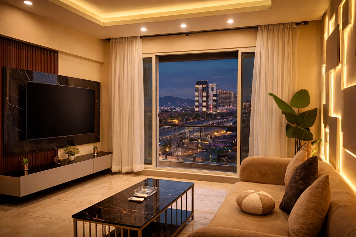 Entra en los apartamentos de 3 dormitorios de Flamingo Grand, los apartamentos con servicio más sofisticados y estéticamente emocionantes de Islamabad. Disfrute de una experiencia segura y con estilo en este lugar céntrico. Tanto si visitas Islamabad por placer como por trabajo, en Flamingo te aseguramos una experiencia de 5 estrellas. Los huéspedes también disfrutan de una plaza de aparcamiento gratuita y segura, wifi gratuito y la experiencia de ver sus series de televisión favoritas en el led inteligente de 65 pulgadas.
