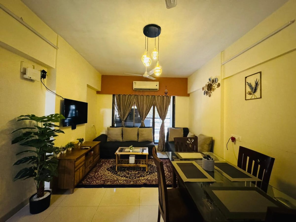 Un hermoso departamento de 2BHK cerca de Nesco, Un ambiente acogedor con un cómodo sofá de 3 plazas y dos sillas puff, Un televisor grande de 55 pulgadas listo para tus necesidades de entretenimiento, Tres aires acondicionados (uno en el living y uno en cada dormitorio) Dos dormitorios bien equipados, cada uno con su propio baño para una máxima privacidad y comodidad. Una cocina totalmente equipada con todo lo que necesitás para cocinar en casa, incluidos utensilios básicos, un horno moderno, una cocina de inducción, una heladera y un lavarropas.