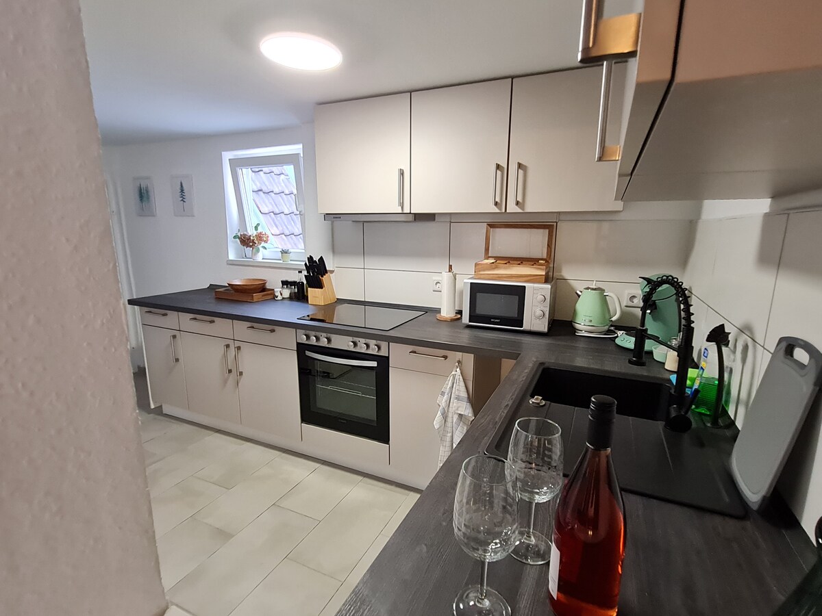 En nuestro apartamento de vacaciones con 40 metros cuadrados de espacio habitable en el sótano encontrará todo lo necesario para sentirse completamente a gusto. El mobiliario moderno y de alta calidad de la sala de estar y el baño le invitan a relajarse en un ambiente acogedor. En la cocina con un acogedor comedor encontrará todo lo que necesita para cocinar y disfrutar de la comida. La acogedora sala de estar está equipada con un cómodo sofá y un televisor. El moderno baño con luz natural está equipado con inodoro y ducha.