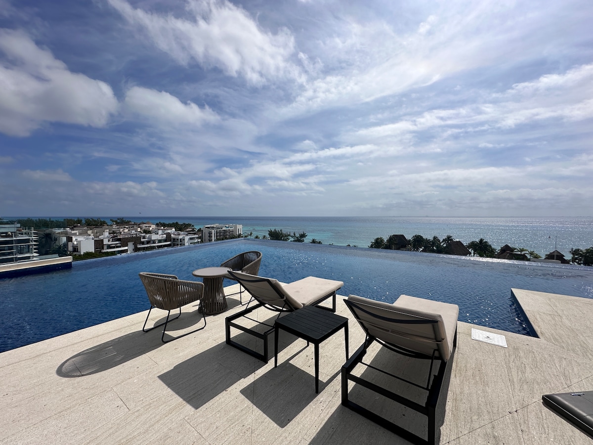Apartamento moderno en el cuarto piso con vista al mar, a un minuto de la playa, de la Calle 38 y de la Quinta Avenida. Tranquilo, luminoso e ideal para una estancia premium en Playa del Carmen. Disfruta del increíble rooftop con piscina infinita, jacuzzi climatizado, bar, solárium, además de estacionamiento privado gratis y seguridad 24/7.