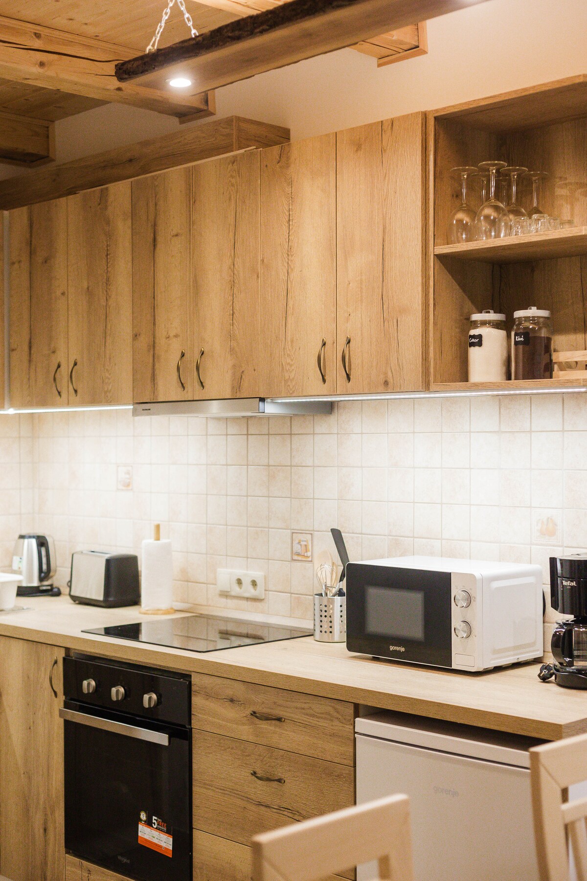 La casa de dos pisos está en un entorno forestal tranquilo. En el nivel inferior, hay una sala de estar con un juego de sofá en esquina que se puede abrir y ofrece oportunidades para dormir para dos personas. La sala de estar se abre a una cocina totalmente equipada. También en la planta baja se encuentra el baño, equipado con inodoro y ducha. En el jardín tenemos un salón cubierto de 30 m2, donde un sofá de jardín para 6 personas y un jacuzzi Wellis Budapest Premium Life para 5 personas intentan servir nuestra relajación.
