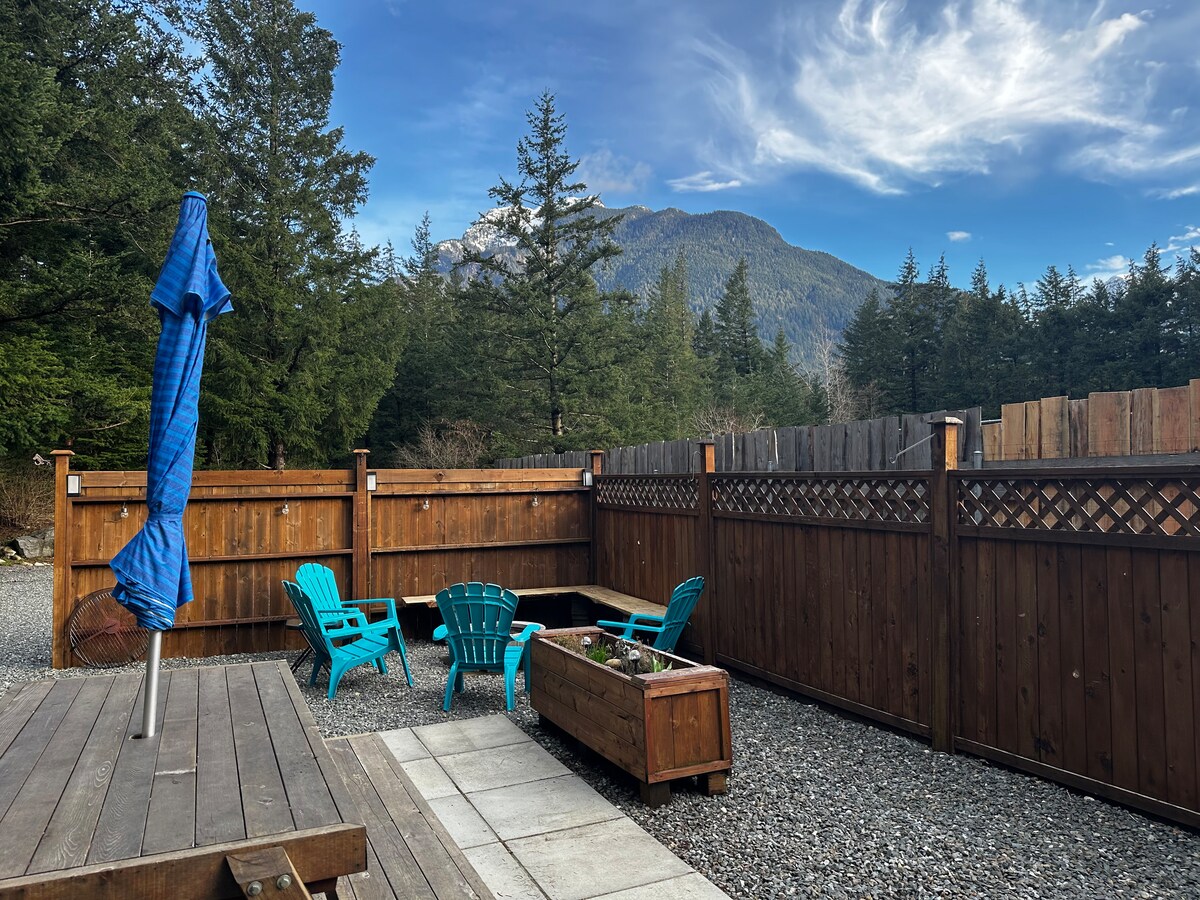 Nuestra elegante cabaña de 2 niveles en Hope, con llamativas paredes interiores de madera curvada, cuenta con tentadoras vistas a la montaña, un arroyo privado en el patio trasero y jacuzzi. Una acogedora casa alpina de 2 dormitorios cerca de playas, parques, la ciudad principal y a poca distancia a pie del paraíso de la pesca y la natación del lago Kawkawa. ¡Esta es una escapada privada a la montaña/lago con todas las comodidades modernas del hogar! La espaciosa sala de estar cuenta incluso con un sofá cama, una cama de día y una chimenea de gas de alta eficiencia, perfecta para algunos huéspedes adicionales.