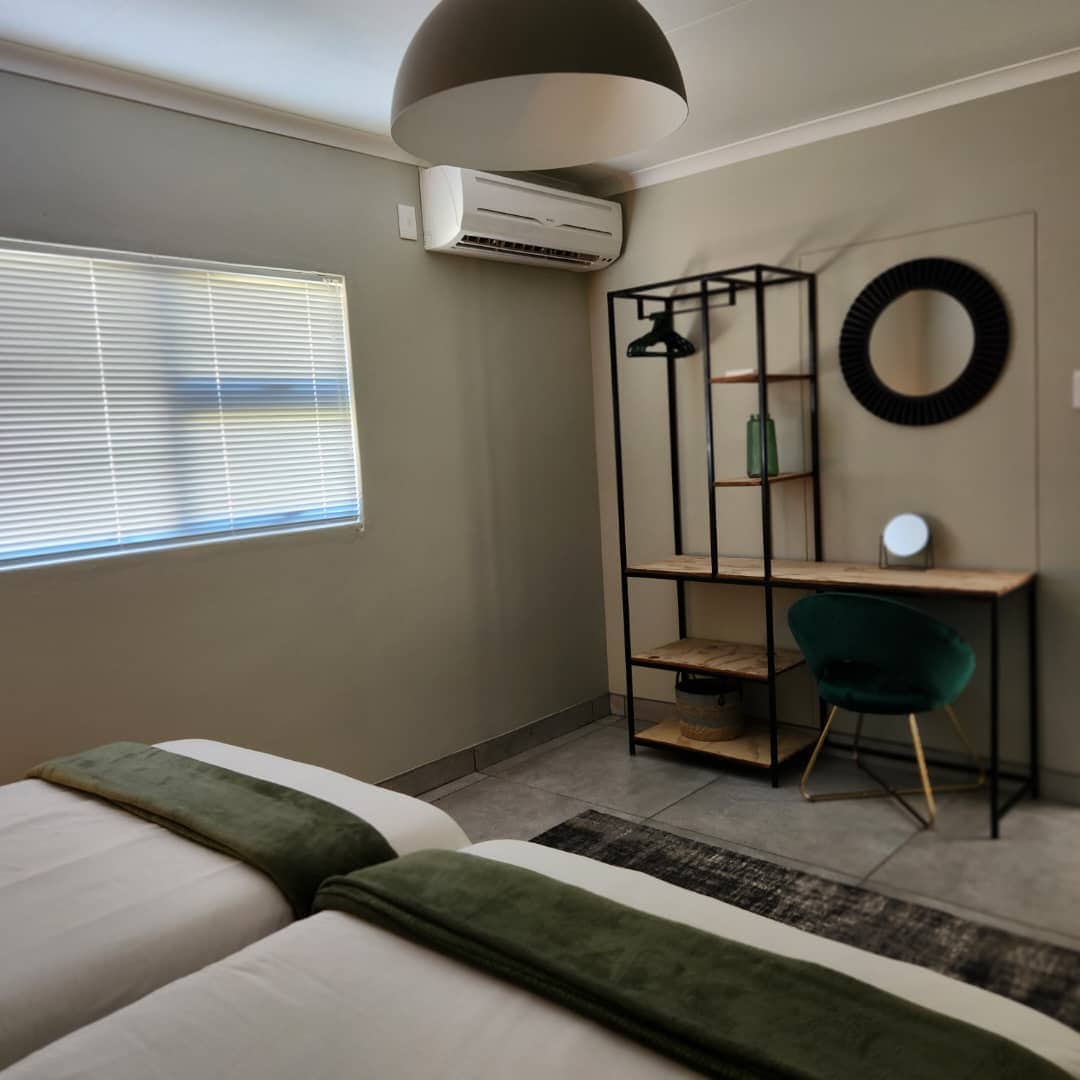 The townhouse is air-conditioned and has a private entrance. The main bedroom is furnished with a double bed and the second bedroom has 2 single beds. Bathroom is fitted with a shower. The open-plan kitchen is equipped with a stove with an oven, microwave, fridge, as well as a breakfast bar. Guests can relax in the lounge which has a TV with full DSTV package, and open onto a deck with braai facilities. Laundry available on request. Safe under roof parking available.