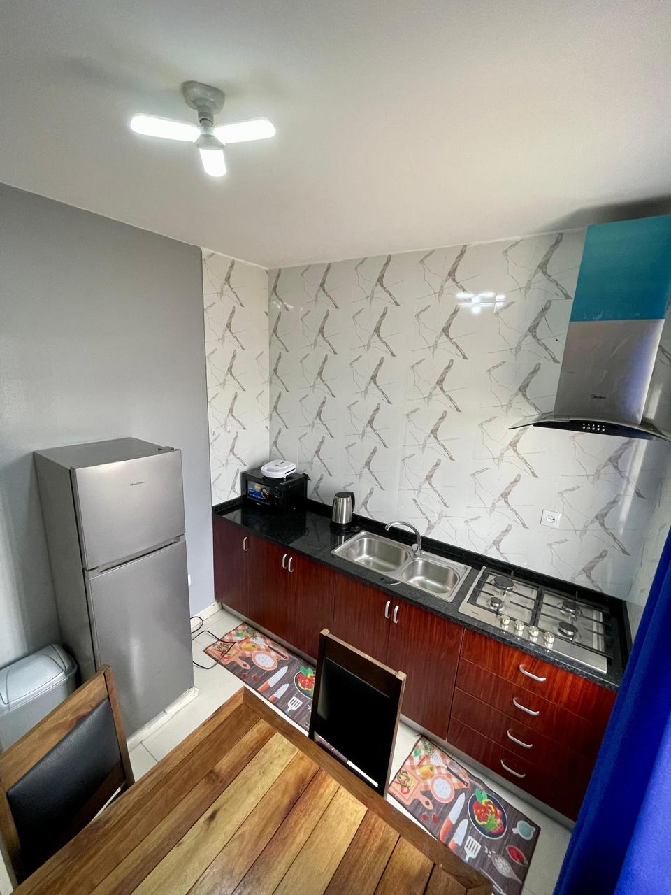 Un departamento totalmente amueblado, un edificio limpio y seguro, ubicado en medio de la ciudad, con cocina moderna, gran sala de estar, TV y wifi.