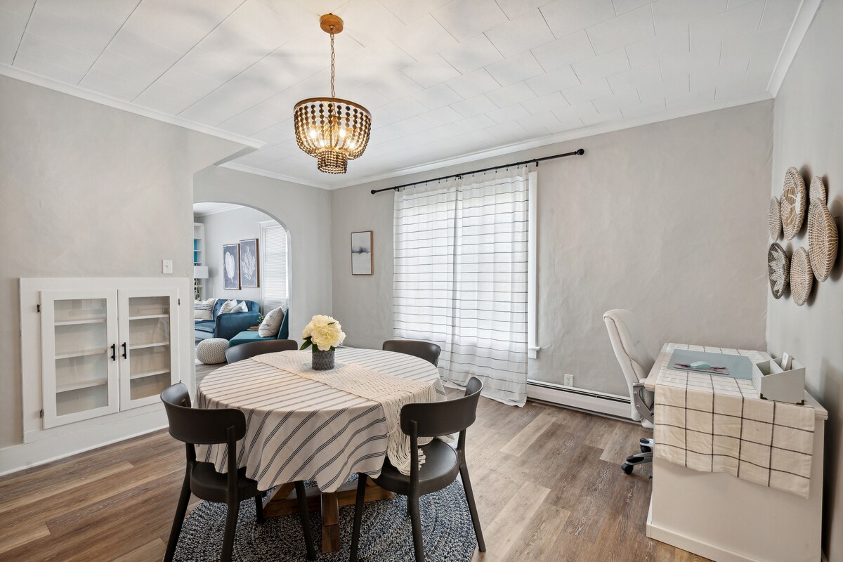 Farmhouse style abounds at this LARGE 3br 1.5ba home proudly located in Uptown Maumee Dora District walkable to everything including the Maumee River! We welcome the Walleye Run Fisherman for the '26 season! Blue themed space has speedy Wifi, oversized kitchen w/ dishwasher & side by side fridge, 55 in smart TV, 1st floor 1/2 ba, dedicated work space & Keurig Coffee maker. Upstairs-3 private beds as well as the full bath. King, Queen, Twin. Full washer/dryer too! Your new home away from home!