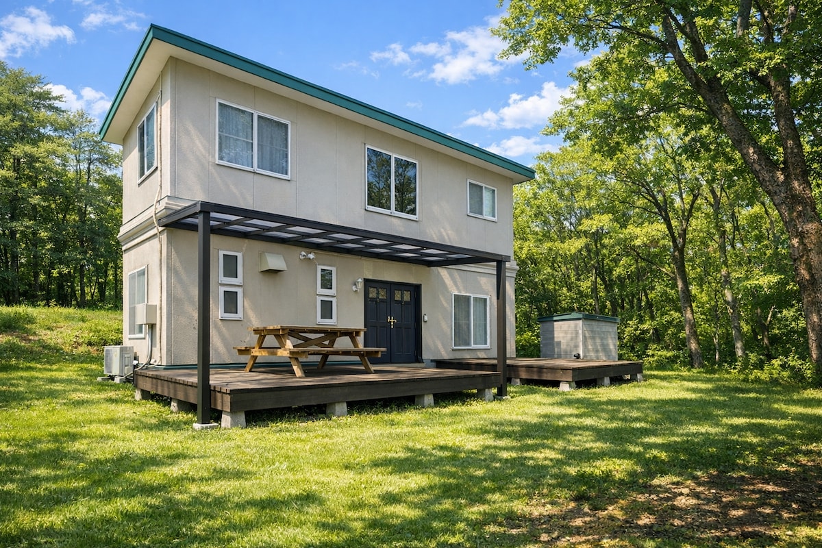 【朝露に濡れる森を眺めながら、テラスで深呼吸する贅沢をどうぞ】 宿泊先 【那須塩原 Sally’s Lodge】 屋根付きのデッキテラスと薪ストーブの炎で心安らぐ、一軒家をまるまる貸切りできます。 那須塩原の静かな森の中に建つ、107㎡・4ベッドルームの一軒家貸別荘です。 最大12名まで宿泊可能で、複数ファミリーや友人グループでの滞在に最適。 吹き抜けの広いリビングには薪ストーブがあり、冬はぬくもりある滞在を楽しめます。 屋根付きテラスでは雨の日でもBBQが可能。芝生の庭では子どもがのびのび遊べます。 敷地内に3台分の無料駐車スペースあり。 周囲には5軒の別荘や住宅しかなく、自然と静けさに包まれたプライベートな空間です。 那須高原・塩原温泉・那須どうぶつ王国などの観光地にもアクセス便利。 四季折々の自然とともに、家族や仲間との特別な時間をお過ごしください。 注意事項 ・当施設周辺の道路は未舗装路(砂利道)となっており幅員の狭い箇所もあります。極端に車高の低いお車は通行できない場合がございます。また道端の草や枝とお車が接触する恐れがありますので、予めご了承ください。