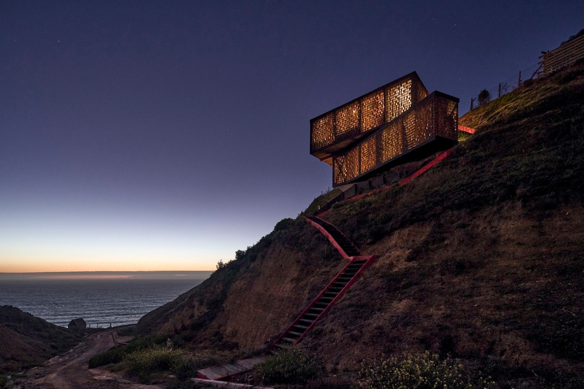 Somos Quebrada Matanzas! Ven a vivir la experiencia en la Quebrada en esta hermosa Casa frente al mar con diseño unico que permitira vivir una estadia unica e inigualable. "Casa Panal" cuenta con 2 dormitorios, 2 baños completos. 2 camas matrimoniales y 1 camarote lo que permite capacidad para 6 huespedes. El acceso a la casa es por la parte superior ( techo). La casa cuenta con 2 terrazas.